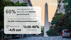 Met Europa is het verschil juist wel flink, Nederland loopt vier uur voor. Outsourcing bedrijven in Argentinië zijn gespecialiseerd in app development, open source-projecten, Cloud Computing, Magento, PhP en DevOps. Zo’n 60% van de IT-bedrijven is ISO9001 gecertificeerd.